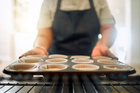 Just removed from oven. Close up shot baking tray full of tasty home treats delicious fresh baked golden muffins cakes in individual paper forms held in baker hands. Homemade bakery production concept