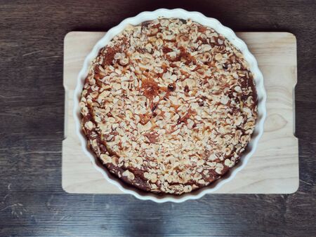 Beautiful nut tart covered glaze in shortcrust pastry shell on white plate displayed on counter fresh delicious dessert perfect for holidays parties and celebrations indulgent sweet treat with nuts