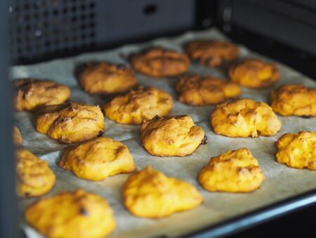 Home cooking.Halloween.Pumpkin cookies with added raisins in the home kitchen oven.