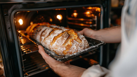 Freshly Baked Artisan Bread Taken Out of Oven by Baker in a Rustic Bakery Setting with Warm Glowing Light AI Generative