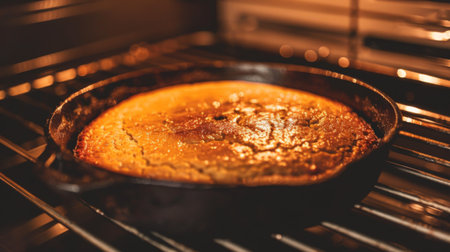 A cast iron skillet with cornbread baking in an oven, golden and delicious