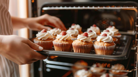A delightful scene featuring freshly baked cupcakes with colorful berries. Perfect for any occasion, showcasing a tempting assortment ready to delight sweet lovers.