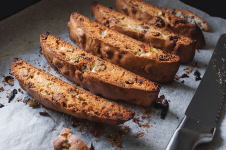 Cantucci sticks cookies with candied fruits and nuts on a white plate. White background, copy space