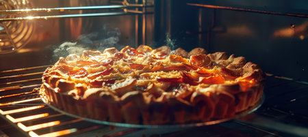 Fresh baked golden apple pie in red dish in hot oven at cozy kitchen