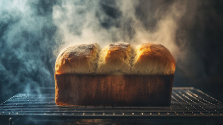 A beautifully baked loaf of bread resting on a cooling rack, with steam rising in the warm light, showcasing the delicious and comforting appeal of homemade baking.