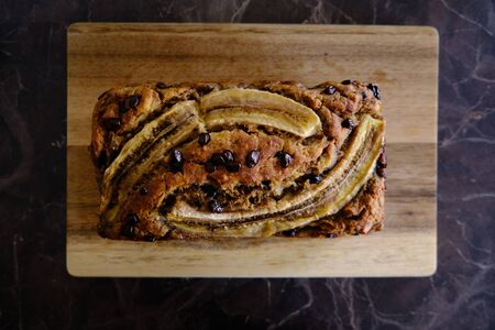 Homemade healthy banana bread served on a wooden board, black marble surface