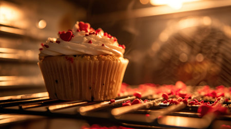 Cupcake decorated with red hearts on a baking sheet in the oven