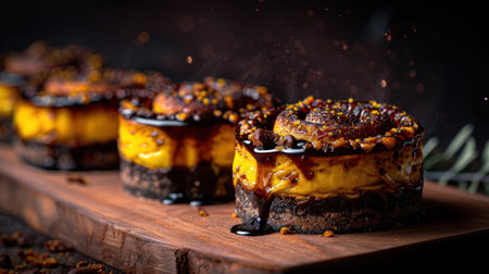 Luxury chocolate cake-cake decorated with a golden decor of caramelized popcorn on a dark background. Flat lay. Close-up. Copy space