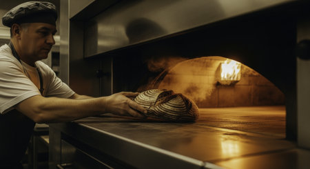 Professional baker carefully places a freshly baked artisan bread loaf into a hot, steaming oven in a traditional bakery setting.