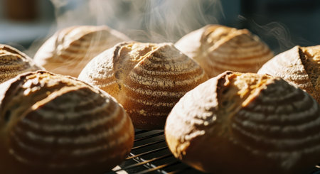 Freshly baked bread loaves cooling on a wire rack in a bakery kitchen, with steam rising and golden crusts glistening in the morning light.