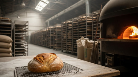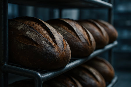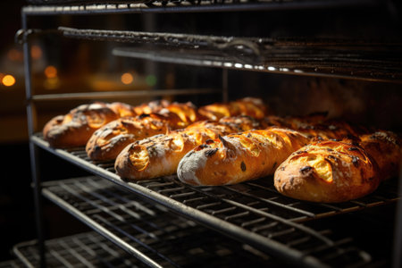 artisan bread cooling on a wire rack in bakery, created with generative ai