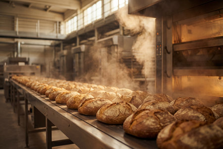 Freshly baked bread on a conveyor belt, moving through an industrial bakery