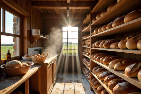 Bread bakery background featuring a brick oven in the background with golden-brown bread cooling on wooden racks, bathed in warm, natural light