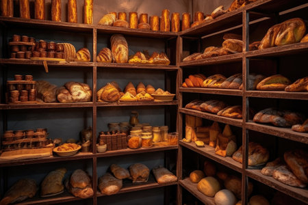 wooden shelves filled with various breads, created with generative ai