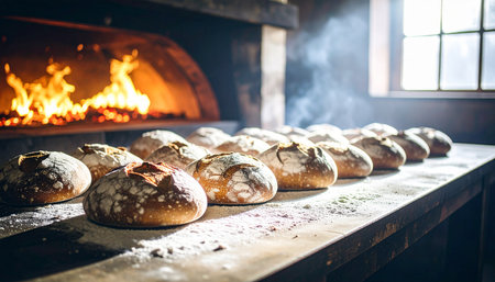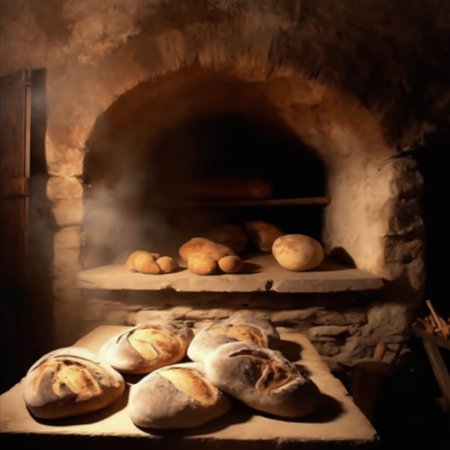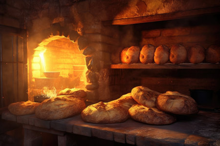 stone oven bread with steam and warm glow, created with generative ai