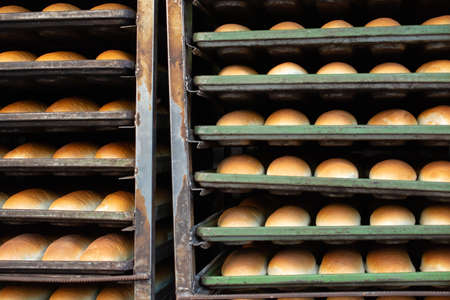 Fresh bread on a mobile rack with shelves. Bread cools down in the open air. Bread cools down in metal containers after baking. The stage of industrial baking. Close-up