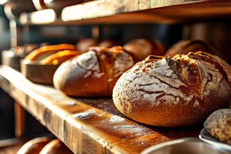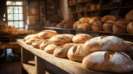 A rustic bakery with fresh, delicious goods in countryside, different bread loaves and baguettes on bakery shop, AI generated
