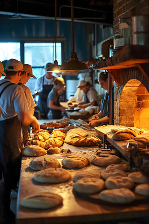 bustling bakery, with bakers in white aprons and hats moving around racks of bread and pastries.