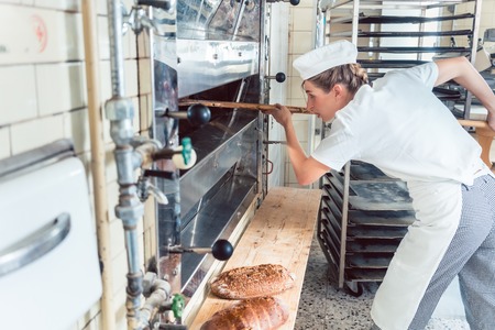 Baker woman getting bread out of bakery oven in her bakery