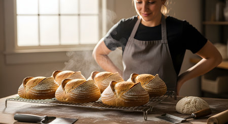 A smiling female baker in an apron stands proudly behind a cooling rack filled with freshly baked, steaming artisan sourdough bread. The warm, rustic kitchen setting highlights the craft of traditional baking and small business ownership.