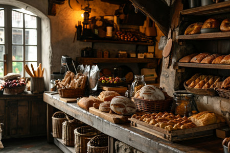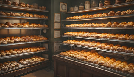 A cozy bakery filled with a variety of freshly baked breads and pastries. Ideal for themes of food, baking, and culinary arts.