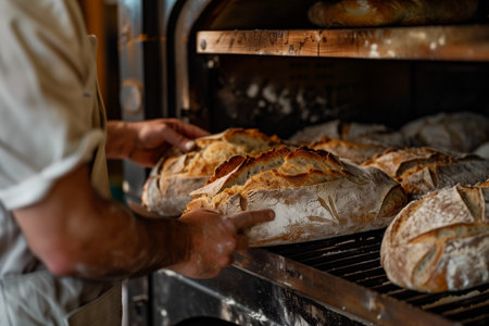 A baker carefully places freshly formed sourdough bread loaves into a hot oven for baking. The oven is rustic, and full. The baker wears a plain apron, indicating the start of a baking process.