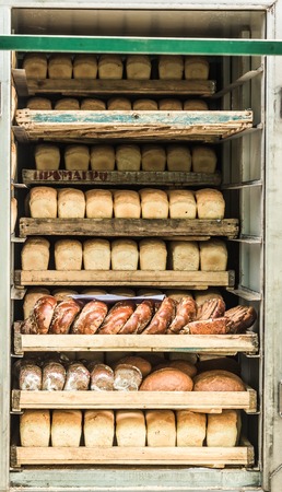 Various bread type on shelf. Bakery car