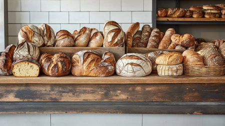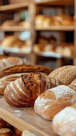 A vibrant bakery scene showcasing an assortment of artisanal loaves, including sourdough, rye, and multigrain, all beautifully arranged in a wooden display.