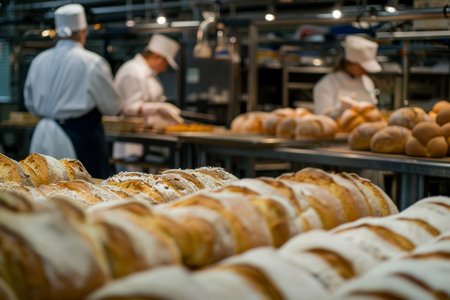 Workers in a food production line prepare packaged bread in a bustling facility