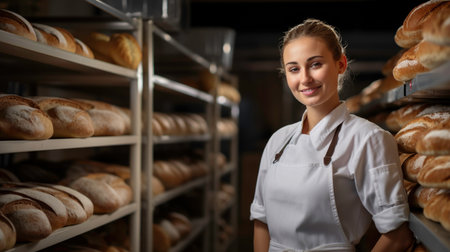Attractive female baker between shelves looking and checking freshly baked bread