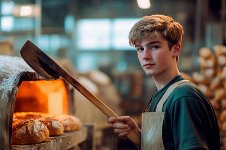In a cozy bakery filled with the rich scent of bread, a young baker skillfully tends to golden loaves emerging from a stone oven. The warm, inviting atmosphere enhances the magic of baking.