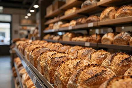 Bread shop interior with shelves full of fresh baked goods in a bakery