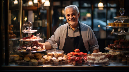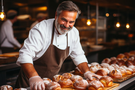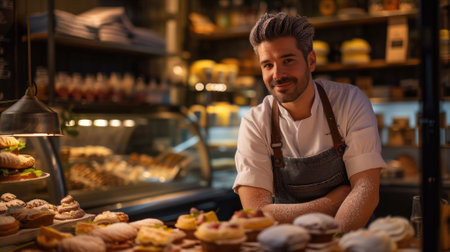 Skilled confectioner gazes through mounds of fresh pastries in a bustling bakery. He wears a chef's uniform and a warm smile, surrounded by culinary creations.