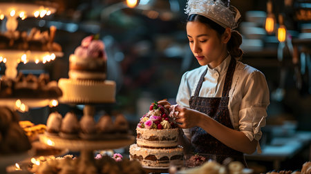 Beautiful young Asian woman pastry chef decorating cake in bakery shop