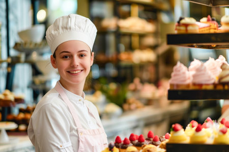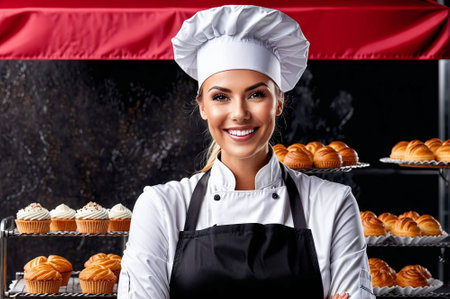 A smiling woman chef stands in front of a bakery display case with a variety of pastries. Concept of warmth and hospitality, inviting customers to indulge in the delicious treats
