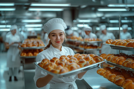 Female baker smiling and holding a tray of golden brown croissants in a bakery, showcasing her baking skills