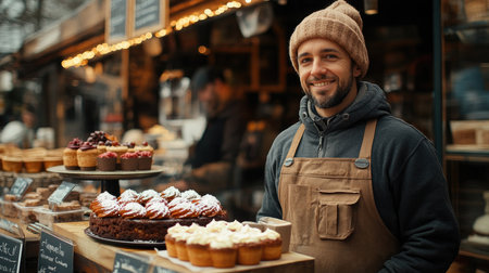 Baker is smiling at his bakery stall in a Christmas market, with many pastries and cakes on display