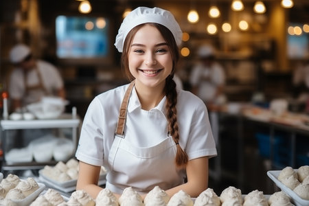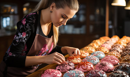 Concentrated young beautiful woman baker cooking making handmade cookies. Pastry bakery production. Generative AI