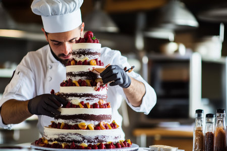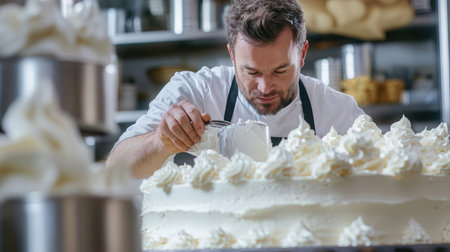 chef in white uniform decorating cake with cream in restaurant kitchen