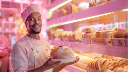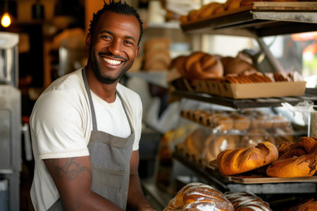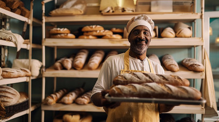 A dark-skinned male baker proudly holds a basket of freshly baked bread in his family-run home bakery.