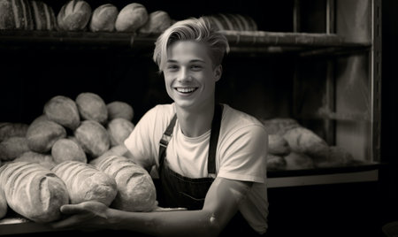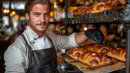 Fresh baked bread for you Cropped image of confident young man in apron taking fresh baked bread from oven and smiling : Generative AI
