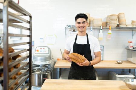 Portrait of a Hispanic male baker holding a loaf of delicious bread and smiling in a bakery
