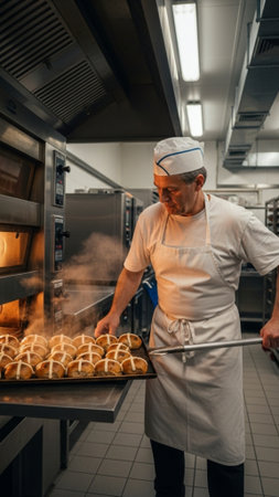 A vertical, full body shot of a professional baker in a commercial kitchen, removing a tray of pipin