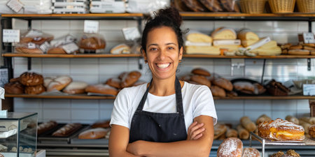 Portrait of a smiling female baker standing with arms crossed in bakery