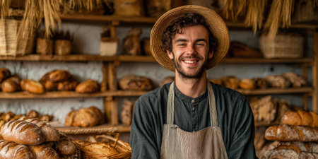 Male baker in straw hat and apron proudly stands in rustic bakery amid wooden shelves of freshly baked artisan loaves, smiling owner showcasing homemade, local bread craft