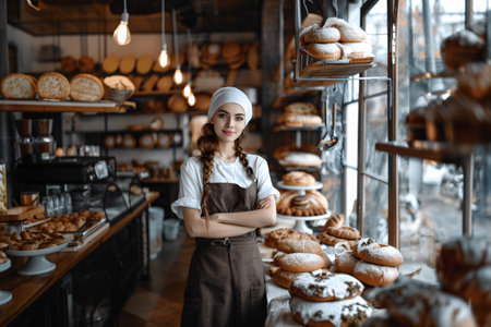 Portrait of a smiling young waitress standing in a bakery and looking at camera