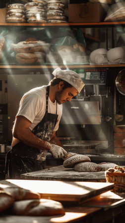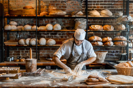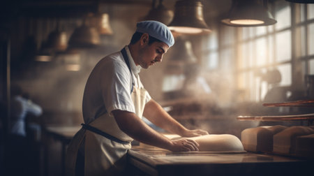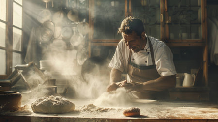 A master baker is captured in a moment of focus as he kneads dough on a floured work surface in the early morning light of a rustic bakery.