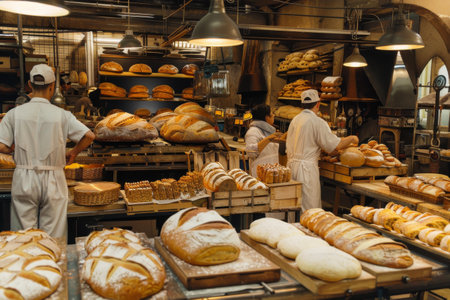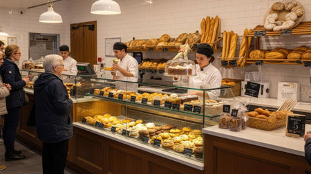 A bakery showcases various baked goods behind a glass display case. Staff members attend customers, creating a lively atmosphere. The scene features diverse types of bread and pastries. The image is brightly lit, suitable for commercial or editorial applications related to food or retail.
