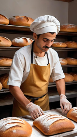 A skillful baker, dressed in a white chef's coat and hat, diligently shapes fresh loaves of bread on a floured work surface.