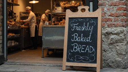 Chalkboard sign outside bakery Freshly Baked Bread on brick wall bakers at work